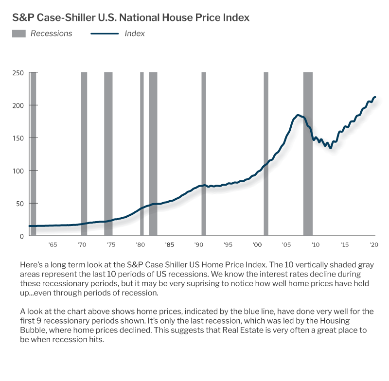 It may sound counter-intuitive, but recessions don’t necessarily mean lower prices for the housing market. In fact, they usually don’t.